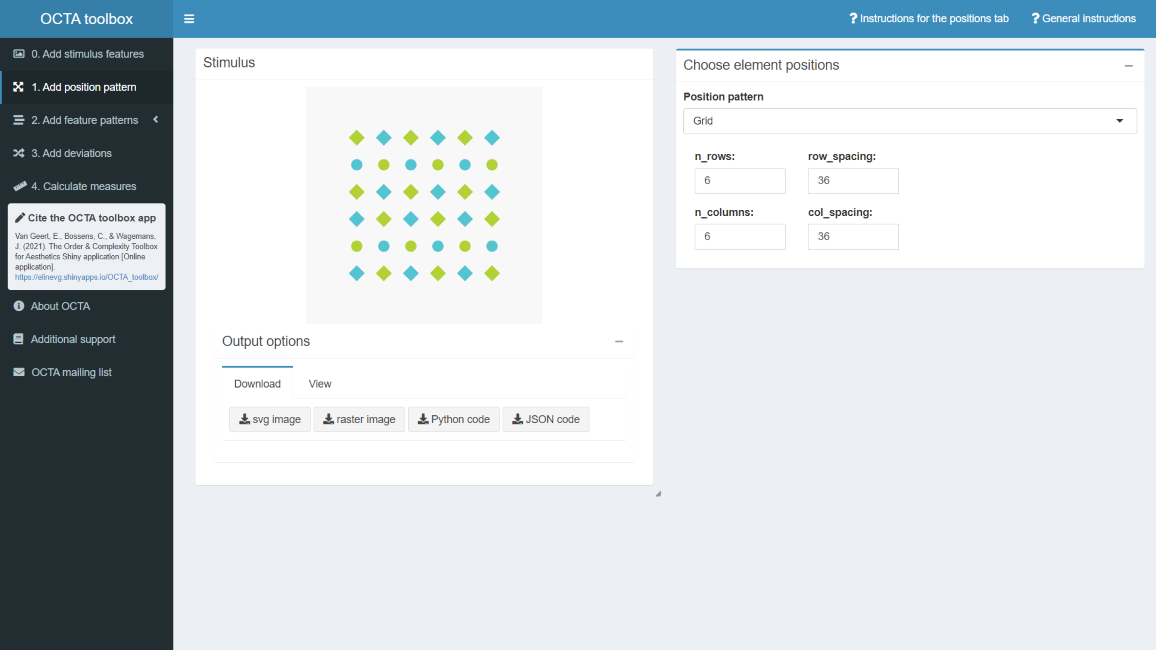 Do individuals prefer stimuli that are ordered, complex, or striking the right balance between order and complexity? Earlier research mainly focused on the separate influence of order and complexity on aesthetic appreciation, or on rather specific types of order (i.e., balance or symmetry). Progress has also been limited by the lack of an easy way of creating reproducible and parametrically controlled stimulus sets, including both order and complexity manipulations. The Order & Complexity Toolbox for Aesthetics (OCTA), a Python toolbox currently under development, aims to fill this gap. It allows for the creation of stimulus patterns varying qualitatively and quantitatively in order and complexity, both based on unity and variety along multiple dimensions (e.g., position, shape, size, color, orientation) of the elements in the patterns. An additional benefit of OCTA is its flexibility: researchers with programming experience can use the available functions or specify additional functionality tailored to their own wishes, whereas researchers less familiar with programming can use the point-and-click interface that is provided.